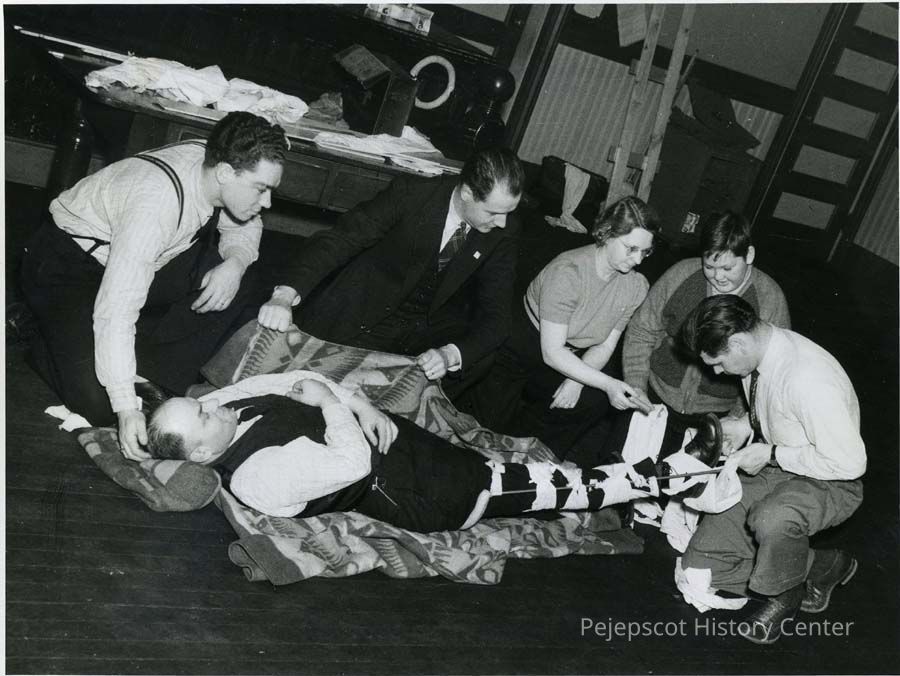 A B/W photograph of Jack Fournier on the floor. And on the left, first is Walter Higgins and Susie Sylvester, simulating an accident. Undated