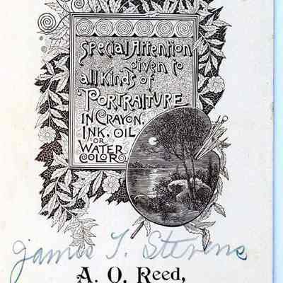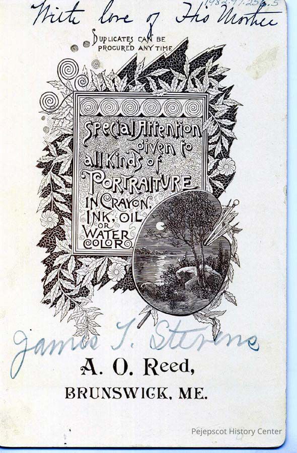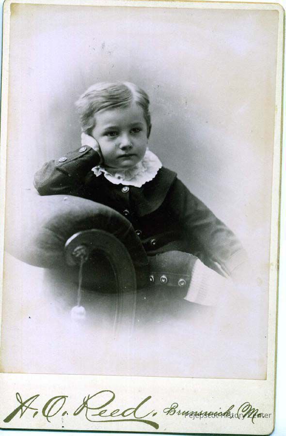 Black & white photograph of James F. Stevens, young boy sitting on sofa. Back is full logo for A.O. Reed, with inscription "With(?) love of His Mother."