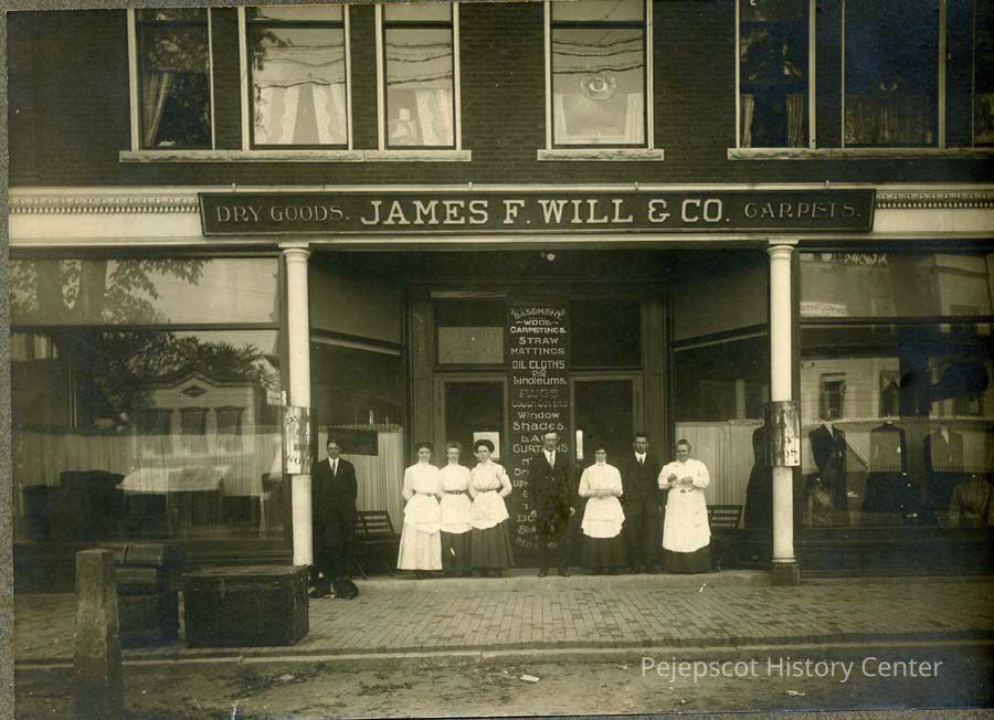 An undated black and white mounted photo of James F. Will & Co Dry Goods Store in Brunswick, Maine. Three men and five women are standing outside of the store front.