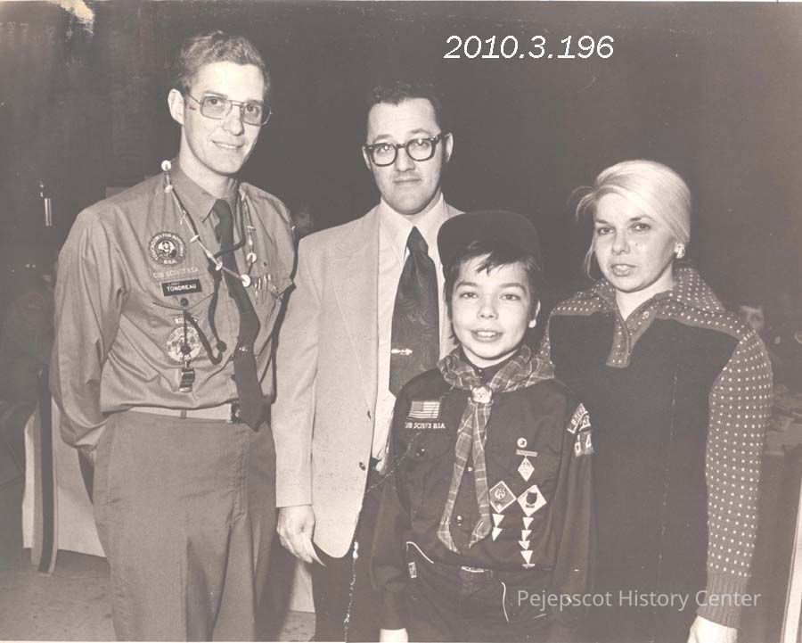 A B/W photograph of Cub Scout James Lesieur receives the Parvuli Dei award from Cubmaster Lawrence Tondreau while his parents watch. Photo published 3/5/1974. Undated