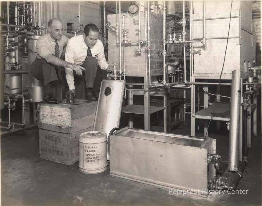 A B/W photograph of two men looking at some machinery. James W. Jean is on the left. Undated