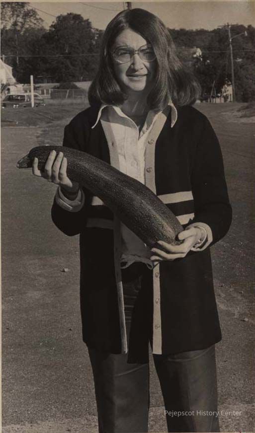 A black and white photo of Jamie K. Dean holding a large zucchini was published in The Times Record in Brunswick, Maine, on 9/12/1979.