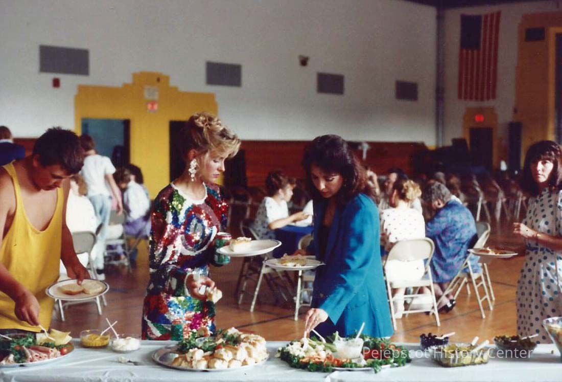 A color photograph of Jane, Jennifer and one of the dancers getting food.