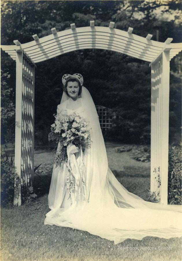 A B/W photograph of Jane Senter at her wedding to Alan Lee. Reception was held at the Senter home at 163 Park Row. 07/16/1945