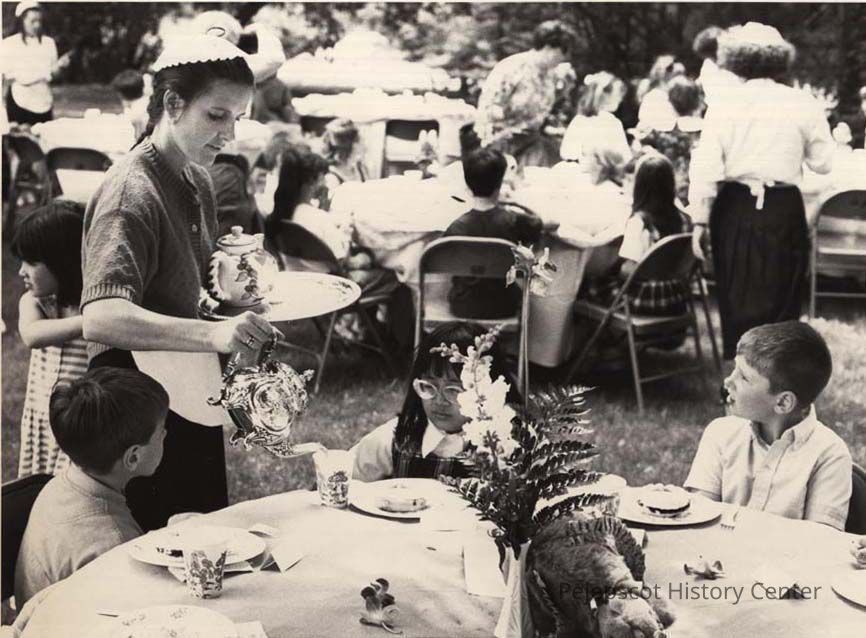 An undated black and white photo of Janet Rousseau pouring "tea" at a tea party at St John's School in Brunswick, Maine.