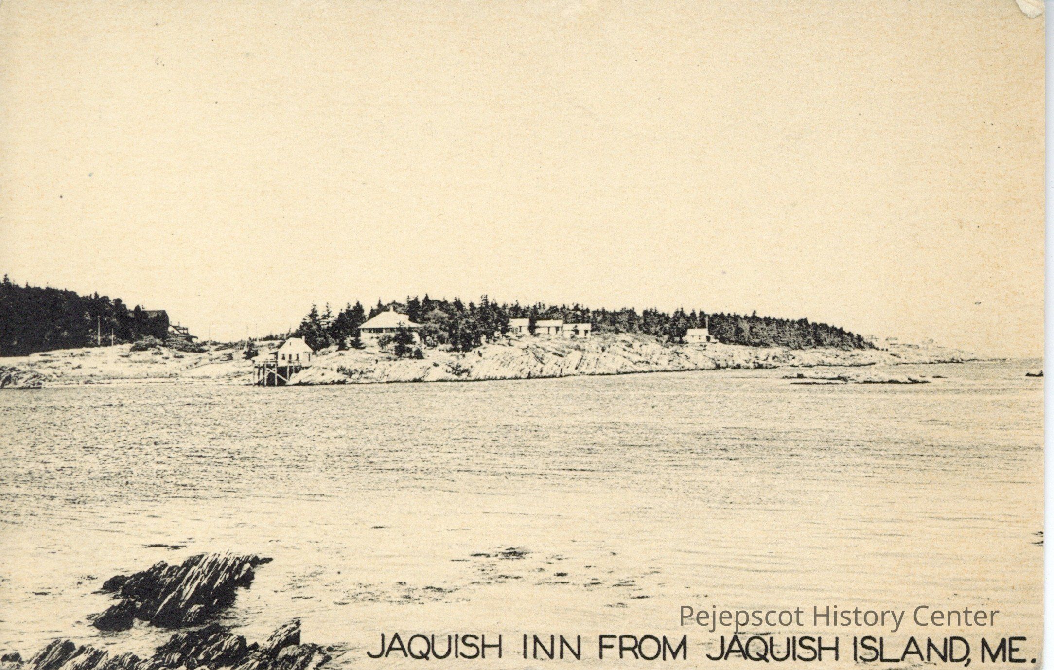 Black and white photo postcard of Jaquish Inn from Jaquish Island, ME.Collection