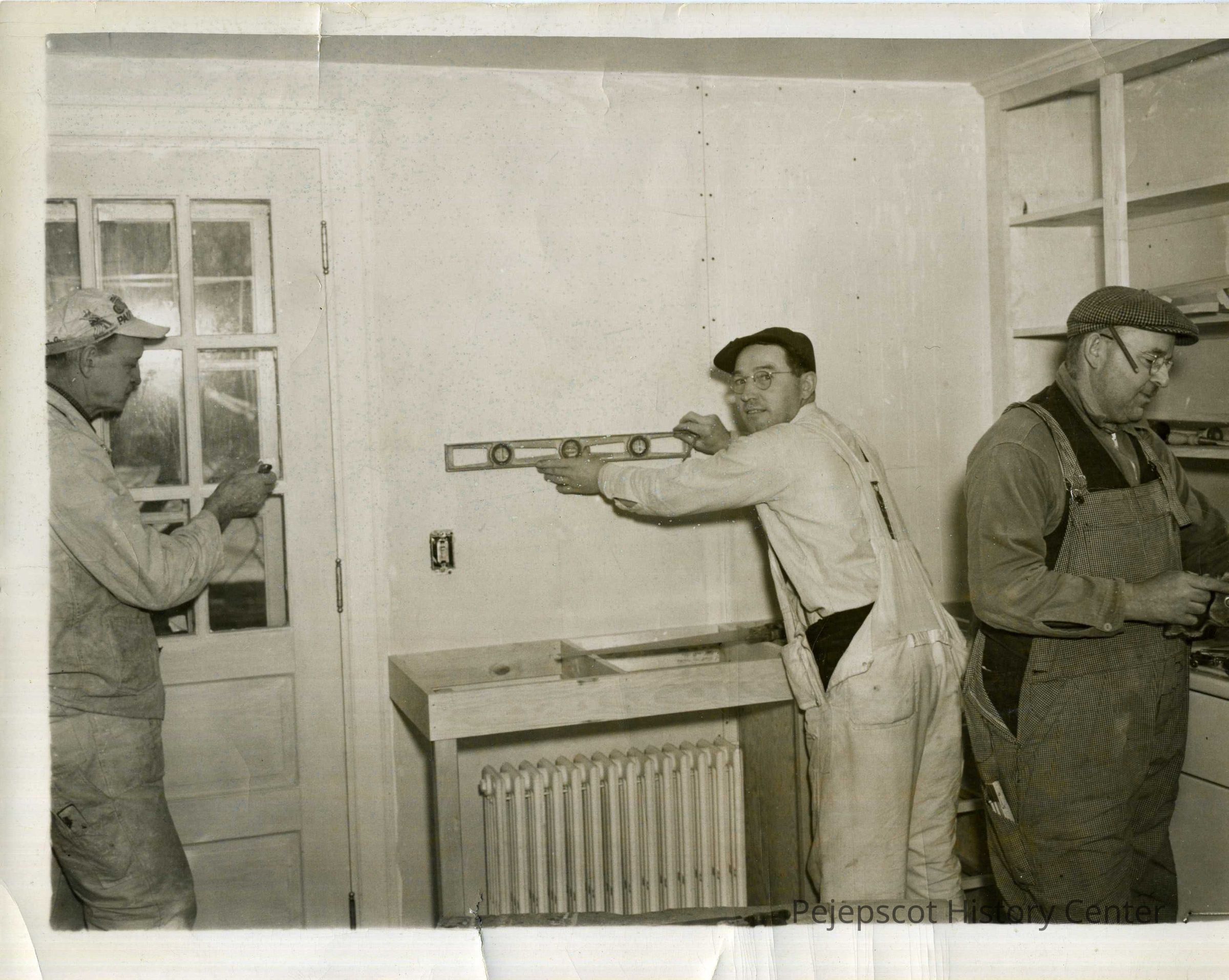 B/W photo of three men working. They are Jean Poulin with level and Edward Deschine on right of Poulin. The man on the left is not identified. 1930.