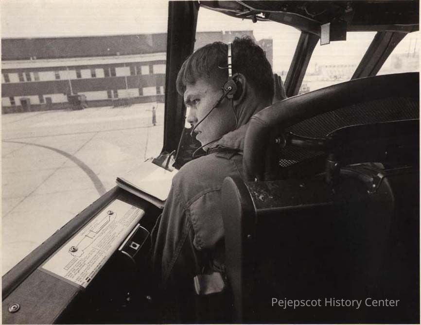 A black and white photo of Lt. Jim Clody in an airplane was published in The Times Record in Brunswick, Maine, on 8/28/1990.