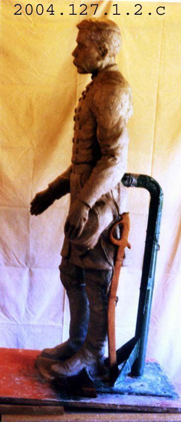 Color photograph of a half size (4 foot) clay model of the J.L. Chamberlain statue. It is part of a group of 6 color photographs of the model glued to a piece of white paper.