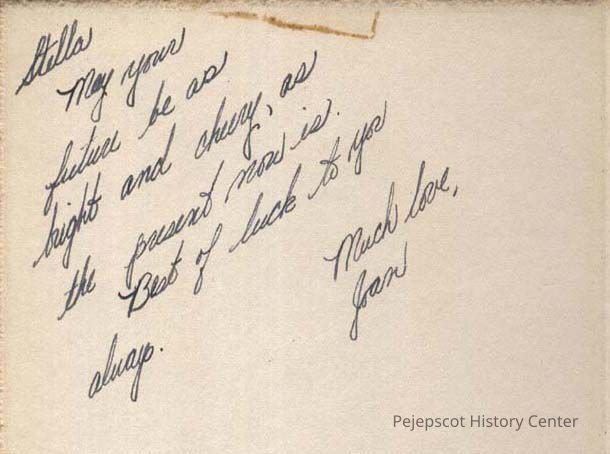 A B/W graduation photograph of Joan Field, Brunswick High School Class of 1951. She gave the photo to Stella Purinton. Undated