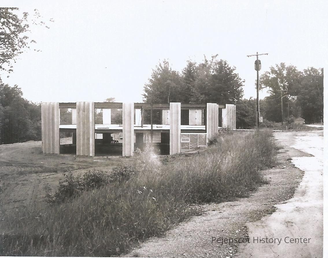 A B/W photograph of the construction of the John A. Cone School in Topsham.