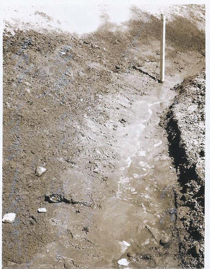 A B/W photograph of the construction of the John A. Cone School in Topsham, this a photo of the "water table" at the construction site.