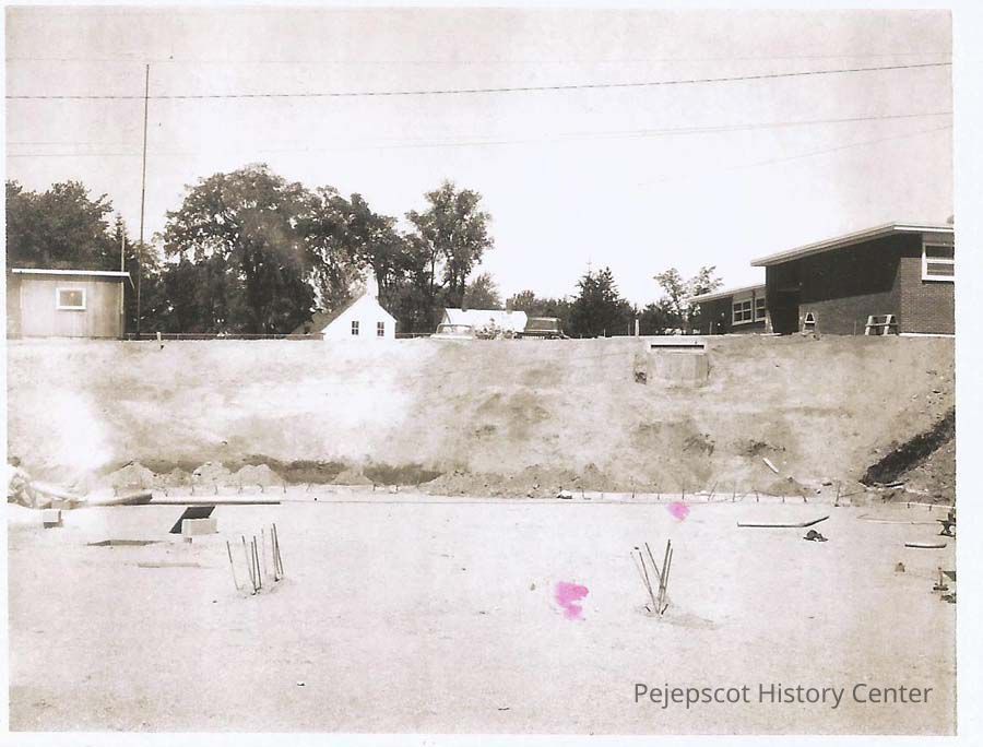 A B/W photograph of the construction of the John A. Cone School in Topsham, showing the basement.