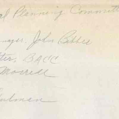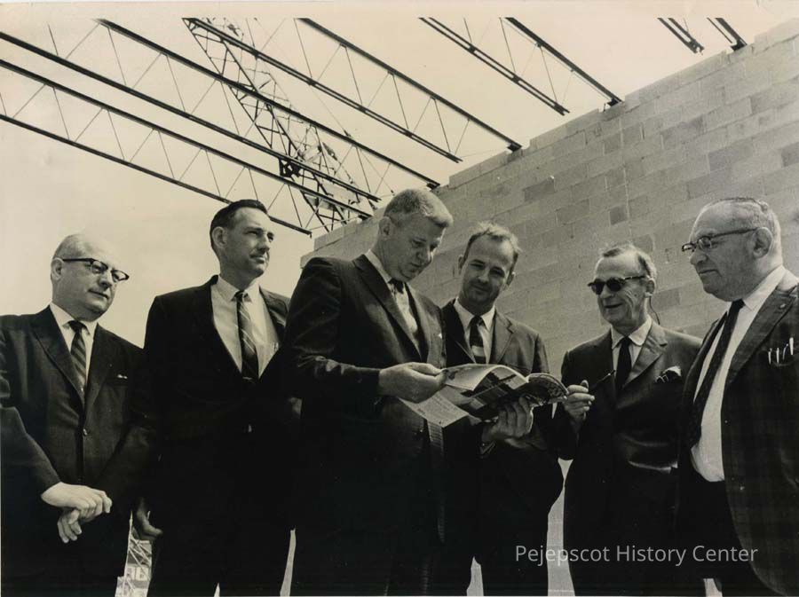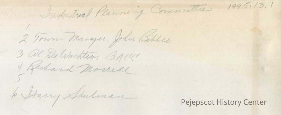 B/W photo of the "Industrial Planning Committee." 2nd from left Town Manager, John Bibber, 3rd Al Dewachter, 4th Richard Morrell, and 6th Harry Shulman. No date.Lexicon