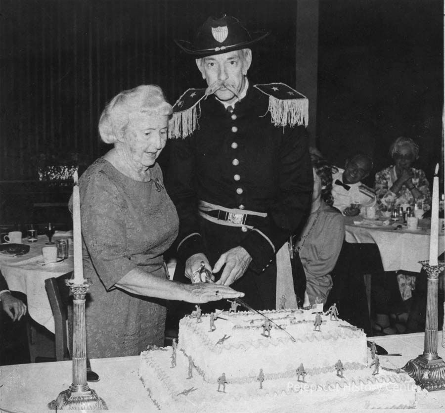 A black and white photo of John Bibber, Brunswick Town Mgr. dressed as Chamberlain with Rosamond Allen to his right. The two are cutting a cake at Joshua L. Chamberlain's 150th birthday party, Sept. 8, 1978.Lexicon