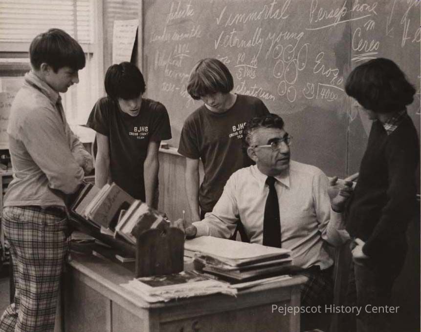 A black and white photograph of John Cakouros surrounded by students was published in The Times Record in Brunswick, Maine, on 11/14/1975.