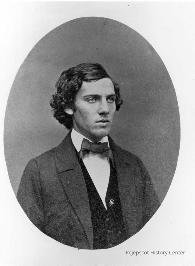A black and white copy print of an oval portrait of John Calhoun Chamberlain of Brewer, ME as a Bowdoin student.