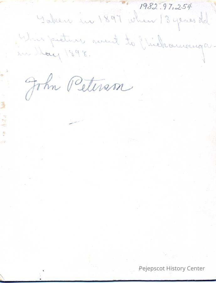 B/W portrait of John Peterson in 1897 at 13 years old. Back states that "This picture sent to Chickamauga in May 1898".