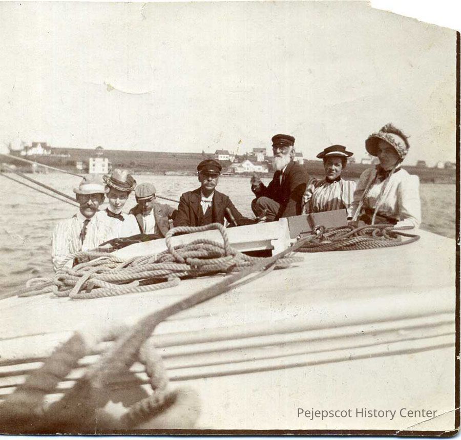 B/W photo of John Peterson (with beard) on boating outing.