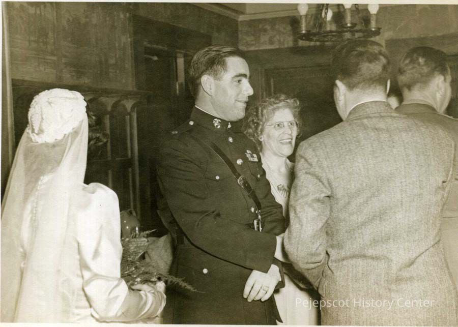 A black and white photograph of Marguerite Martin & John R. Chaisson at their wedding reception at the Hotel Eagle with three guests. 02/22/1946