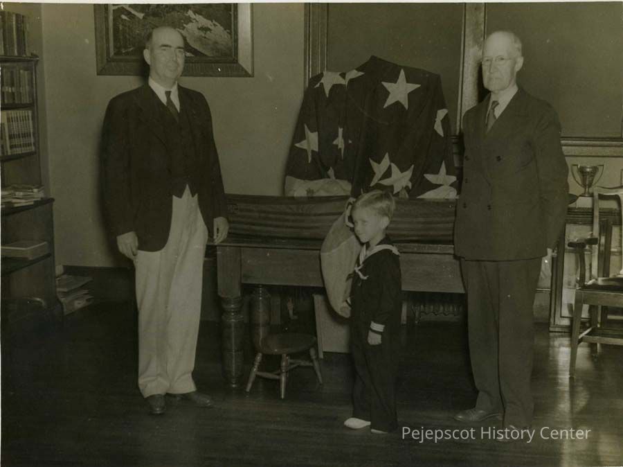 A B/W photograph of John Riley and two others standing by an American flag. Undated