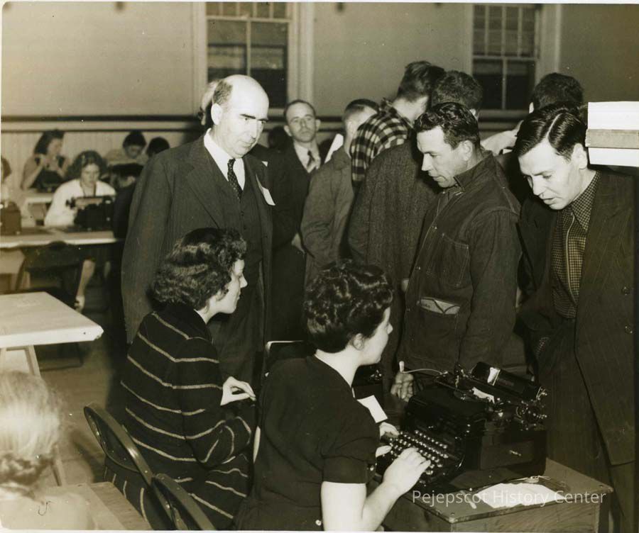 A B/W photograph of Town Clerk John W. Riley looks on as Mrs. Eleanor Black and Madelyn Ouellette register the young men from Brunswick and Bowdoin College for the WW II draft. Undated