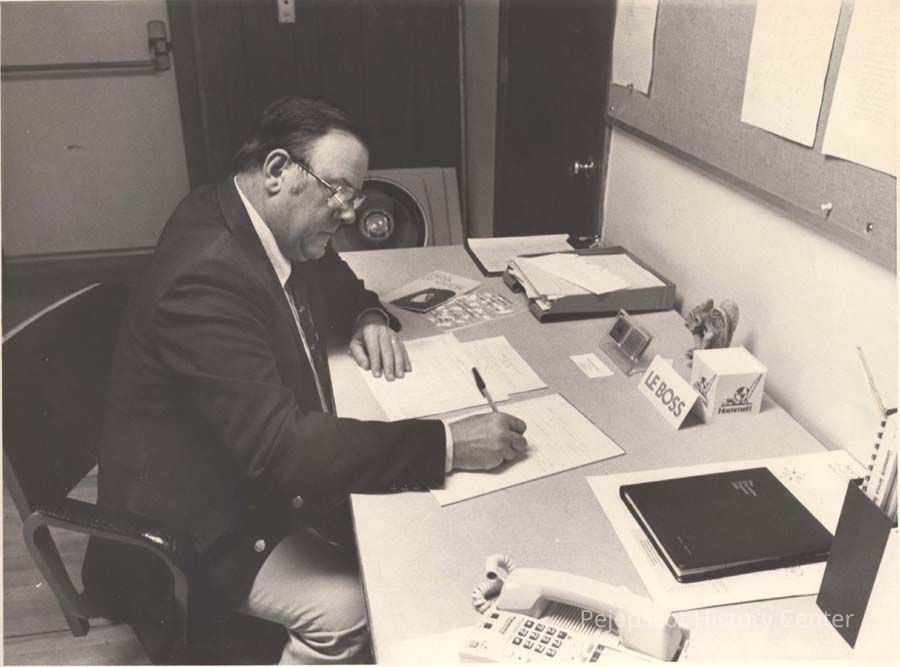 A black and white photograph of John Weldon, principal of Suggs Middle School, Lisbon Falls, was published in The Times Record in Brunswick, Maine, on 5/8/1986.