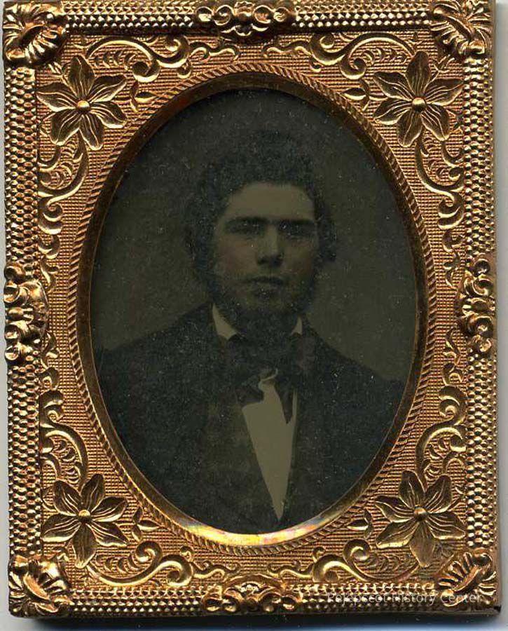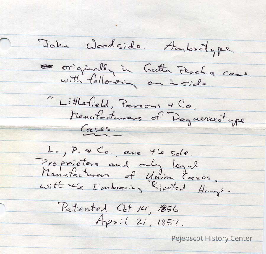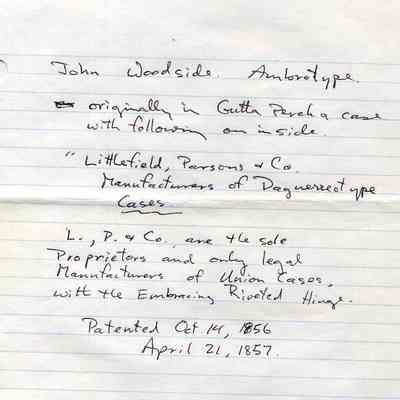 Ambrotype photograph of John Woodside in ornate copper (?) frame. Paper enclosed with photo reads: "John Woodside Ambrotype orginally in Gutta Percha case with following on inside: 'Littlefield, Parsons & Co. Manufacturers of Daguerrotype Cases. L.P. & Co. are the sole Proprietors and only legal Manufacturers of Union Cases, with the Embracing Riveted Hinge. Patented Oct. 14, 1856. April 21, 1857.'"