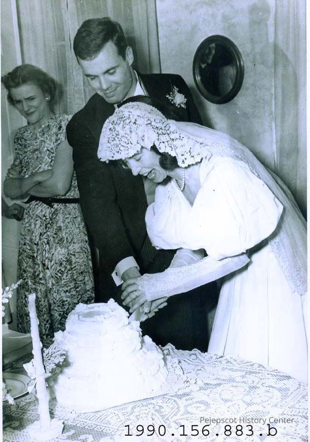 A B/W photograph of the Johnson wedding. Mrs. Mary Johnson and her husband cut their wedding cake as guests look on. Undated