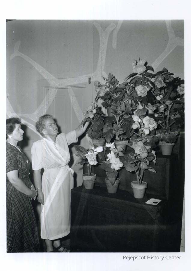 B/W photo of Mrs. Ralph Jordan and Mrs. Coral Bamforth inspecting Alfred Senter's begonias. There are several plants all in bloom.