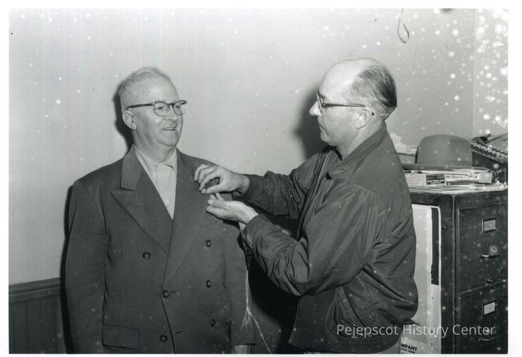 Joseph C. Brannigan of Topsham receives a 45 year pin from Charles E. Hunter of Erwin, Tennesse, production manager of Consolidated Feldspar.