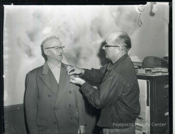 Joseph C. Brannigan receiving his 45 year pin from Charles E. Hunter, Tenn., Production Manager of Consolidated Feldspar Corp., May 17, 1955.