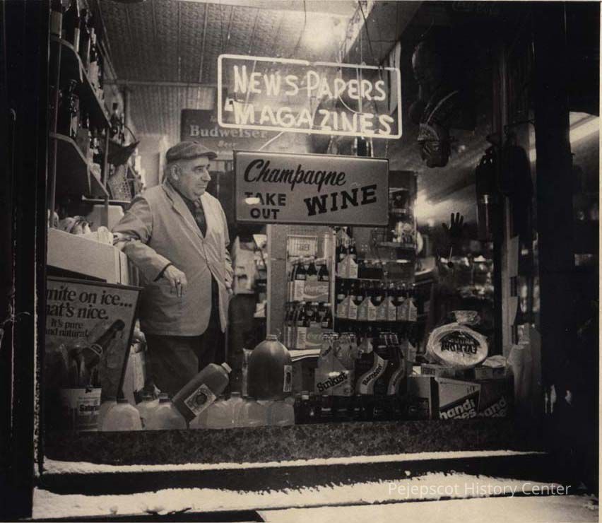 A black and white photo of Joseph Fiori, an owner of Kennebec Fruit Co. on Maine Street in Brunswick, watches motorists trying to get home in a snow storm, was published in The Times Record in Brunswick, Maine, on 11/19/1980.