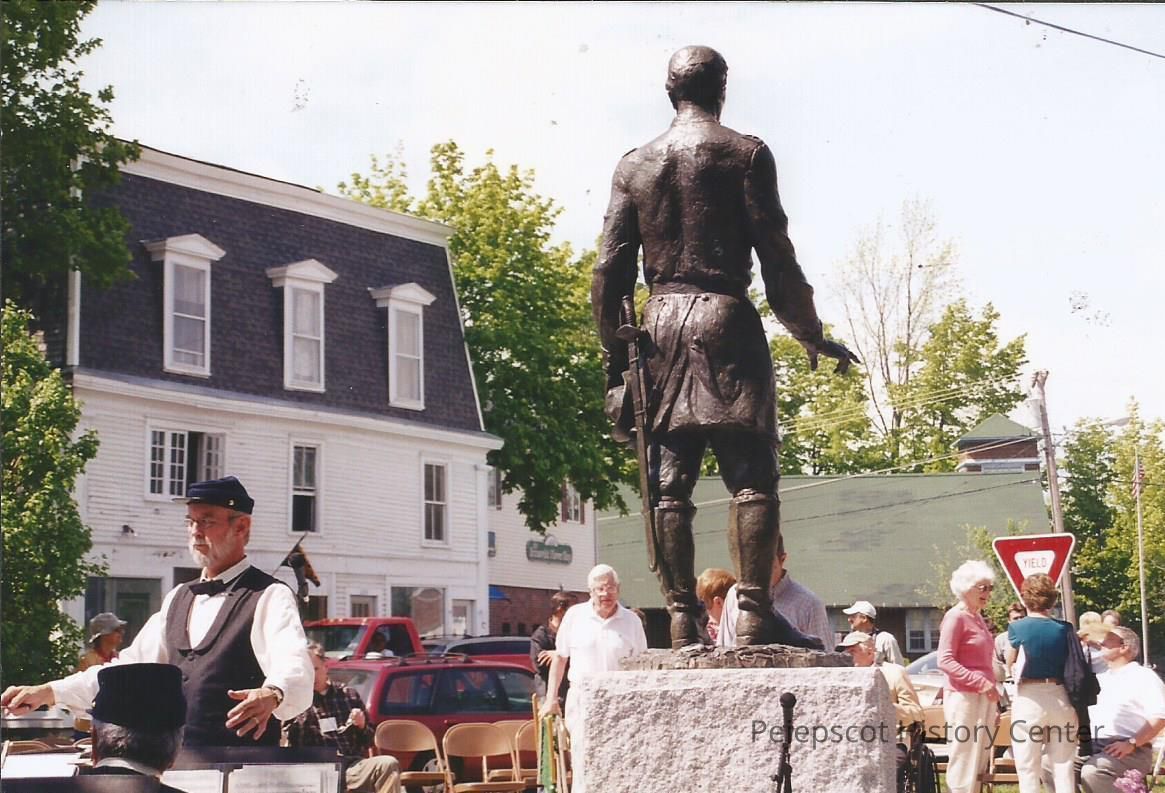 A color photograph of the backside of Joshua's statue looking out at Maine Street and the crowd in Brunswick, ME. Undated.