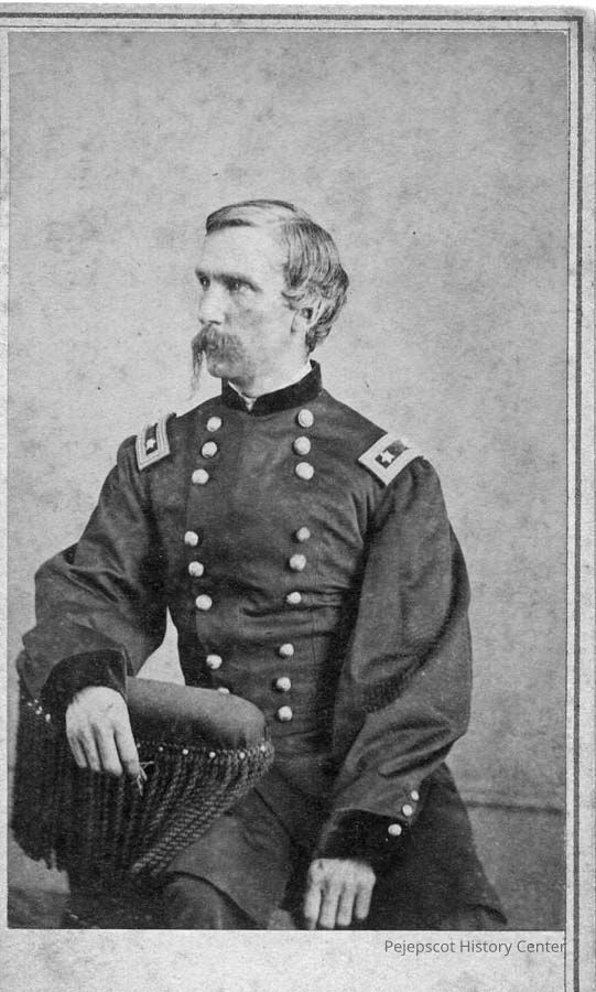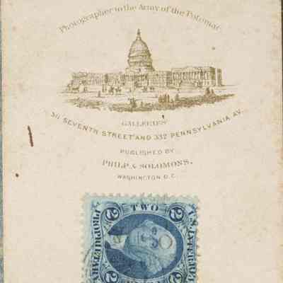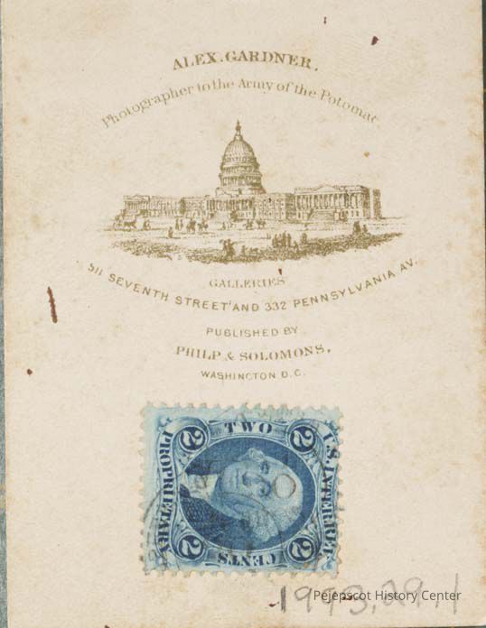 A black and white portrait of Joshua Lawrence Chamberlain taken in the summer of 1865 (?). Here, he is seated in an armchair in the uniform of a major general. Printed on reverse: Alex Gardner/photographer to the Army of the Potomac...with View of Capital. Two cent stamp affixed.