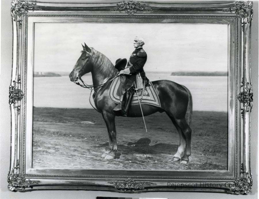 Framed photograph of J. L. Chamberlain on horseback, around 1900, background apparently retouched. Described in photos 1 and 2 of this accession as Old Home Week in Portland.