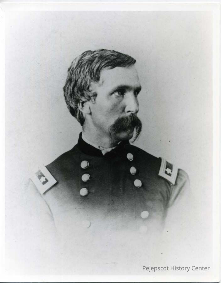 A black and white photo of Joshua L. Chamberlain. The photo is the official Army photo from the National Institute of Health Archives.