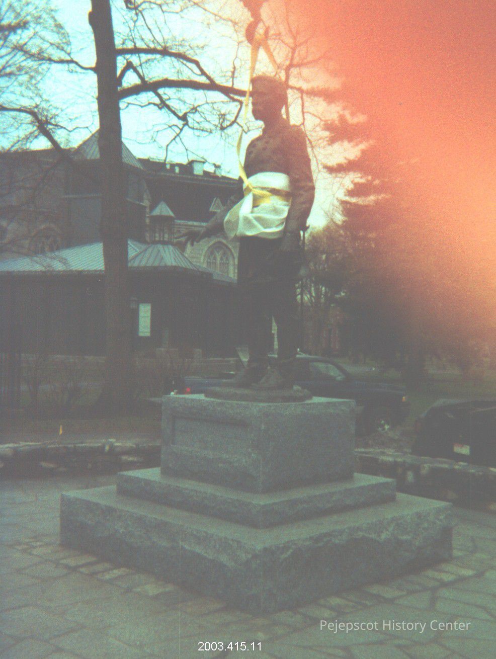 A color photograph of the Joshua L. Chamberlain statue in Brunswick, Maine, in position and still being supported up by sa crane on 5/9/2003.
