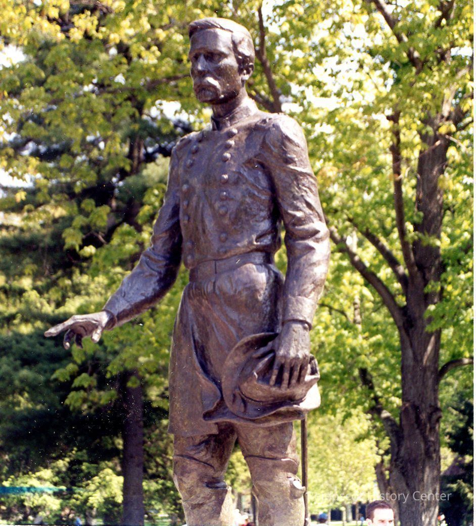 A color photograph of a view of Joshua L. Chamberlain's statue. Dated Fall, 2004.