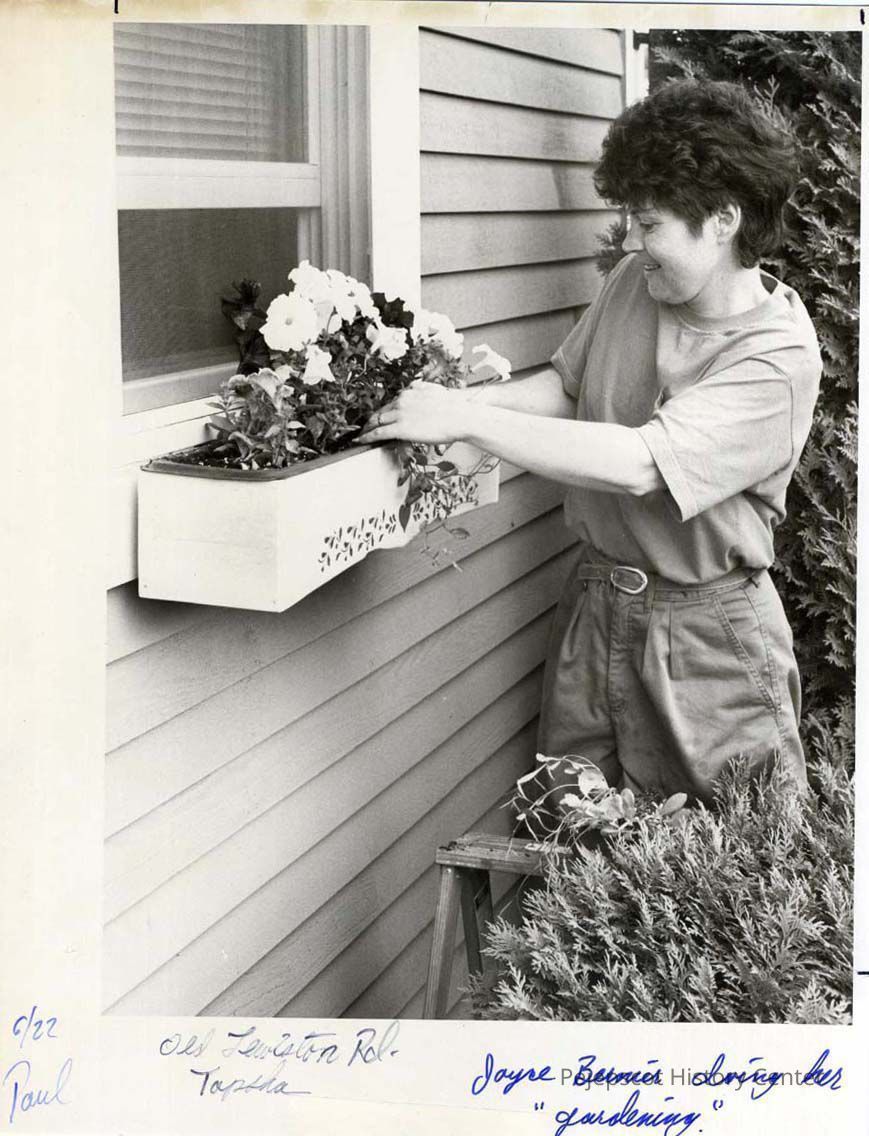An undated black and white photograph of Joyce Bernier doing gardening at her home on the Old Lewiston Road in Topsham, Maine.