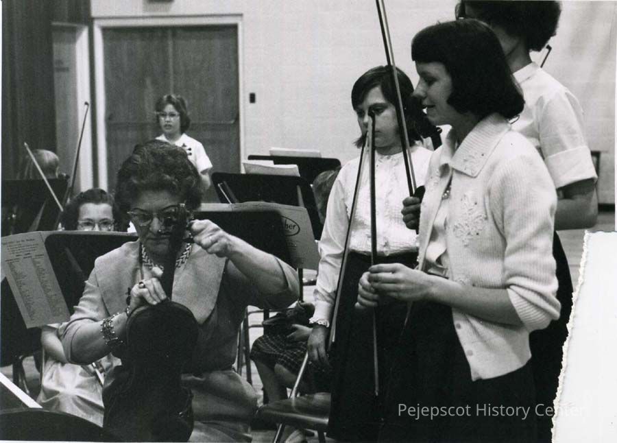 A B/W photograph of the Junior High School string ensemble tuning up. c. 1962