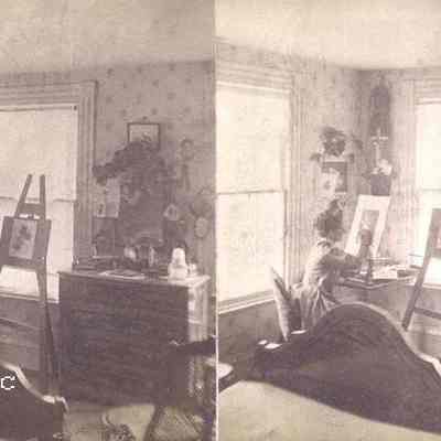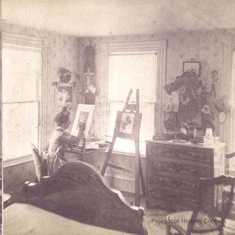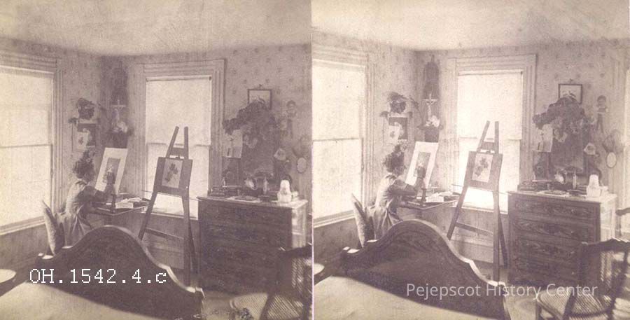 Botanist Catherine “Kate” Furbish (1834-1931) devoted over 60 years of her life to collecting, classifying, and illustrating the native flora of Maine. Furbish studied drawing, painting, and French literature in Portland, Boston, and Paris. She is pictured here painting flora on an easel in front of her bedroom window. She collected over 1,300 plants and pressings, and compiled them in a book donated to Bowdoin College.