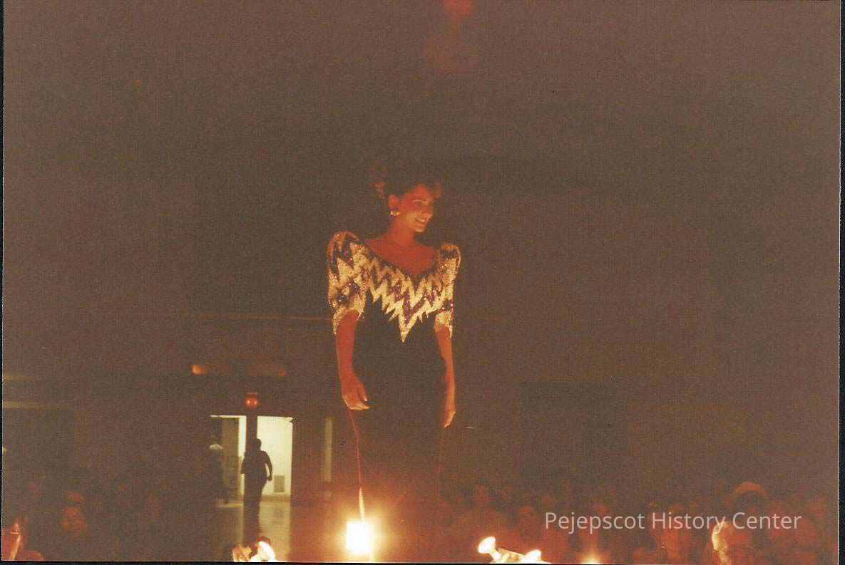 A color photograph of Katherine Albano walking down the ramp. Photographer's # 4-32 CYO sponsored