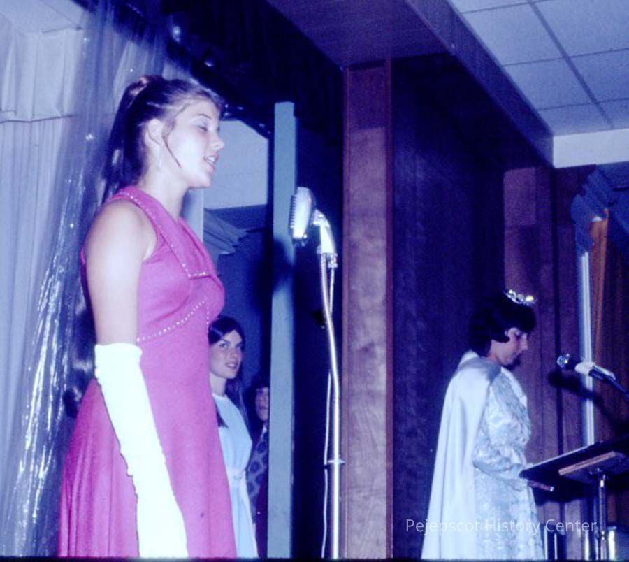 A 35 mm color slide of Kathy Livernois a contestant in the 1973 Miss Teen Queen Pageant. Susan DiEdwardo is standing behind the curtain and Doris Bernier, a former Teen Queen, is standing at the podium. The slide is marked, "10." Undated