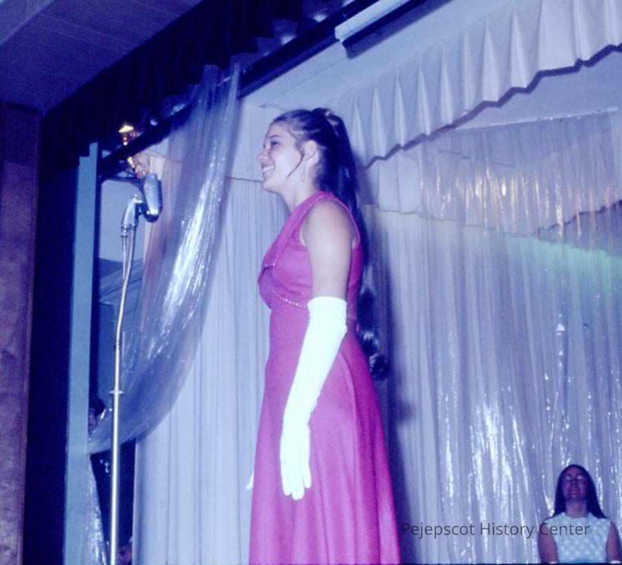 A 35 mm color slide of Kathy Livernois, a contestant in the 1973 Miss Teen Queen Pageant. Diane Racine is sitting in the background. The slide is marked, "8." Undated