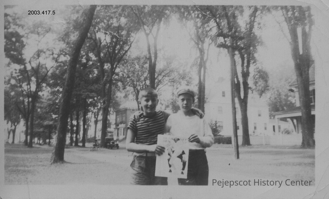 A undated black and white photograph of Kenneth Shaw and Melvin Rahu of Brunswick, Maine, shows them standing on the on the Mall. The Skolfield/Whittier House can be seen in the background.