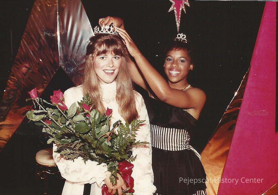 A color photograph of Teen Queen 1983-84 Kim Carslick crowning the 1984-85 Teen Queen Kelley Donovan.