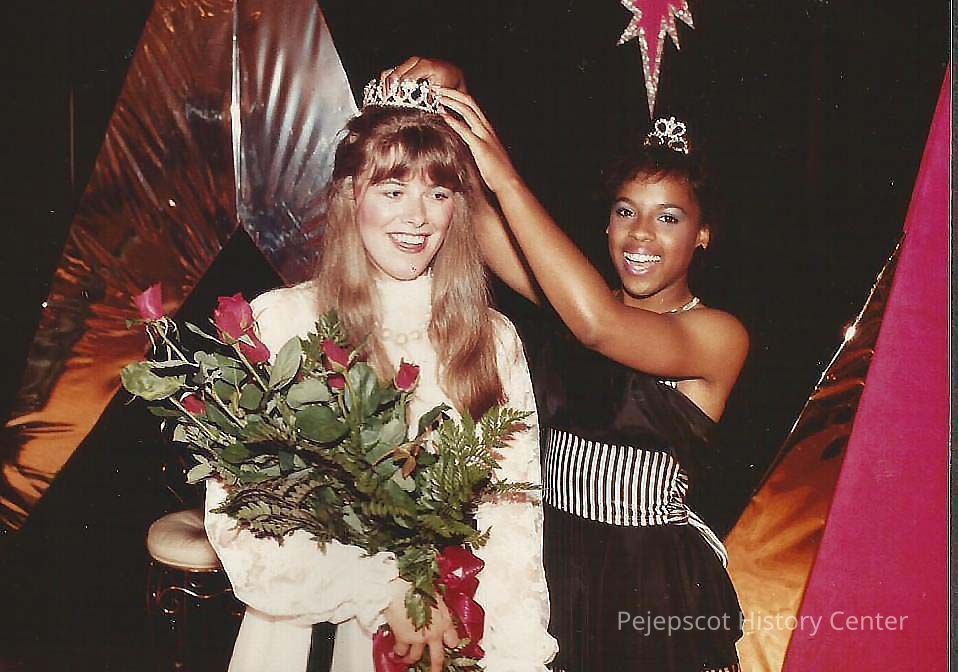 A color photograph of Teen Queen 1983-84 Kim Carslick crowning the 1984-85 Teen Queen Kelley Donovan. Photographer's # 23 A