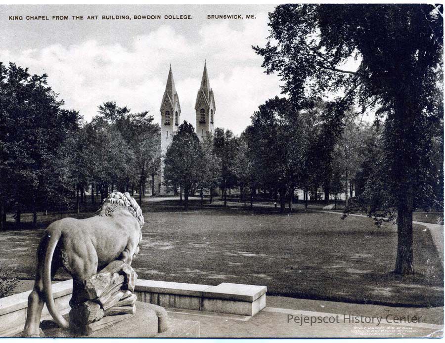 B/W postcard view of King Chapel from the art building, Bowdoin College.