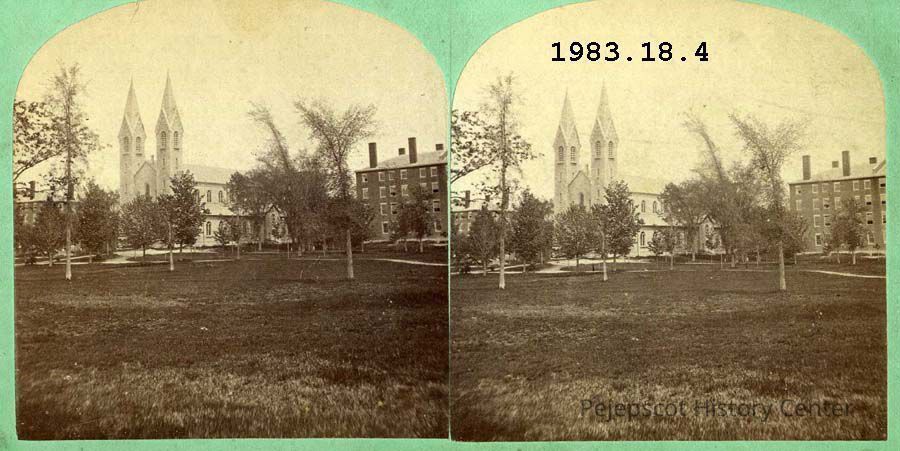 A stereopticon view of King Chapel at Bowdoin College. Parts of Maine and Appleton Halls are visible.